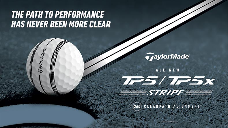 The TaylorMade TP5 Stripe is a 5-layer tour performance golf ball featuring a 360° ClearPath Alignment™ system, which is a digital band with a continuous black line designed to provide a visual aid for putting and tracking ball spin, maximizing your alignment and feedback on the green and around the course.